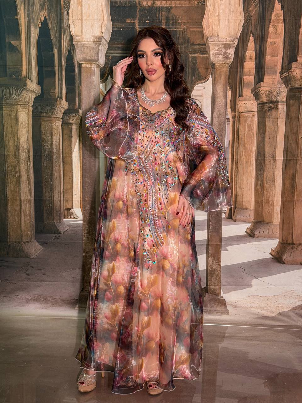 Exquisite multi-tone jlabiyah featuring a rich blend of warm, jewel-inspired hues