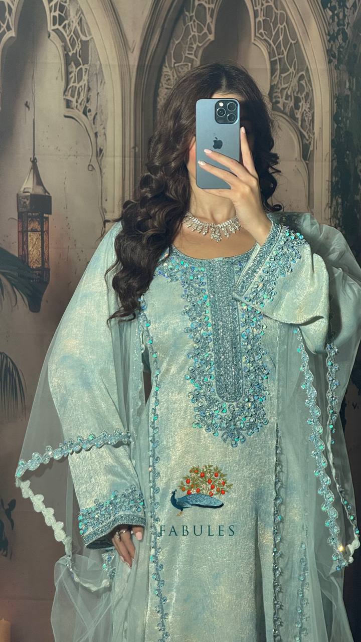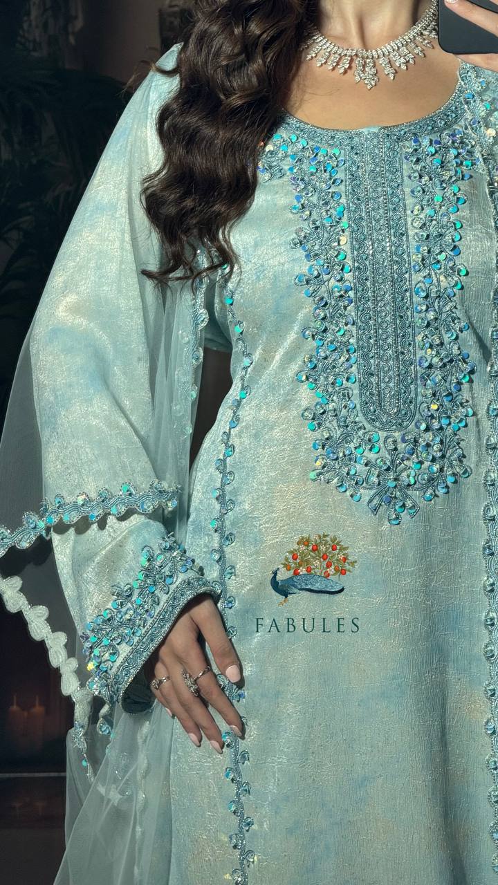 Embellishments feature blue and turquoise crystal accents arranged symmetrically