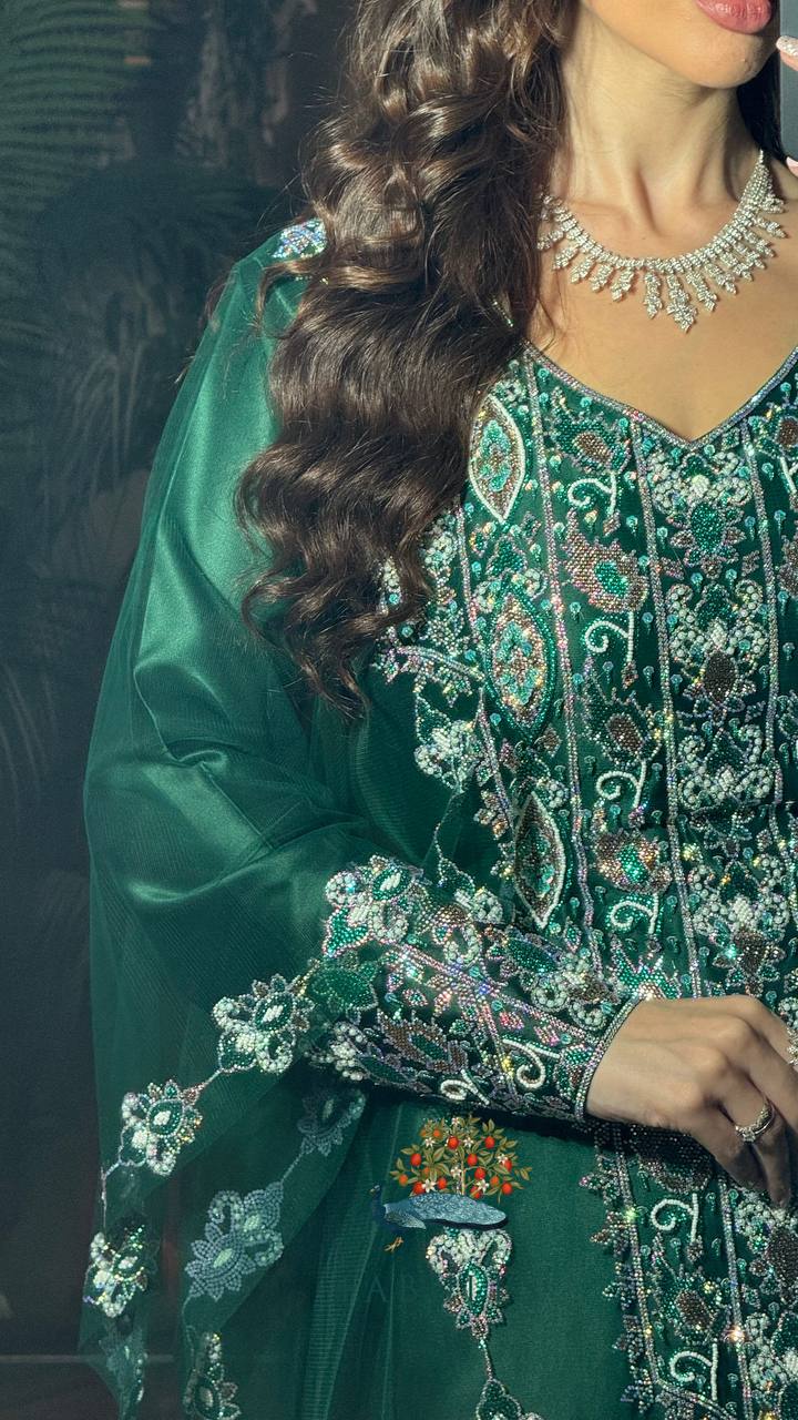 Sheer green sleeves with delicate floral embroidery and beaded accents