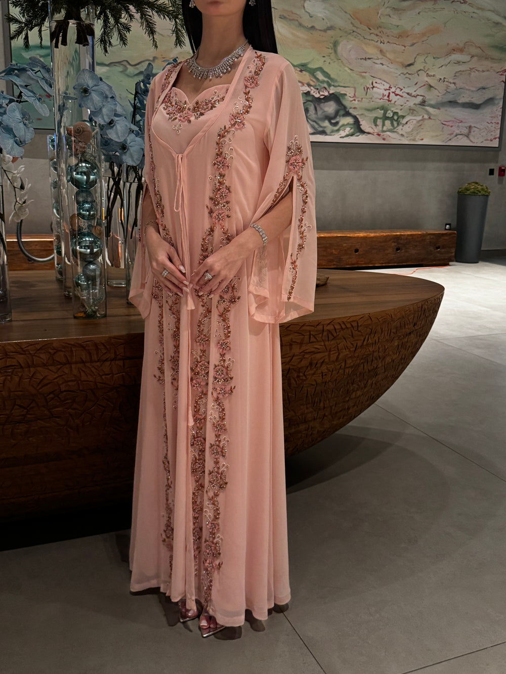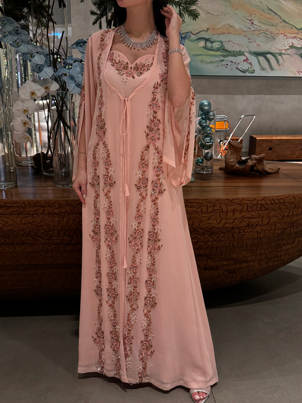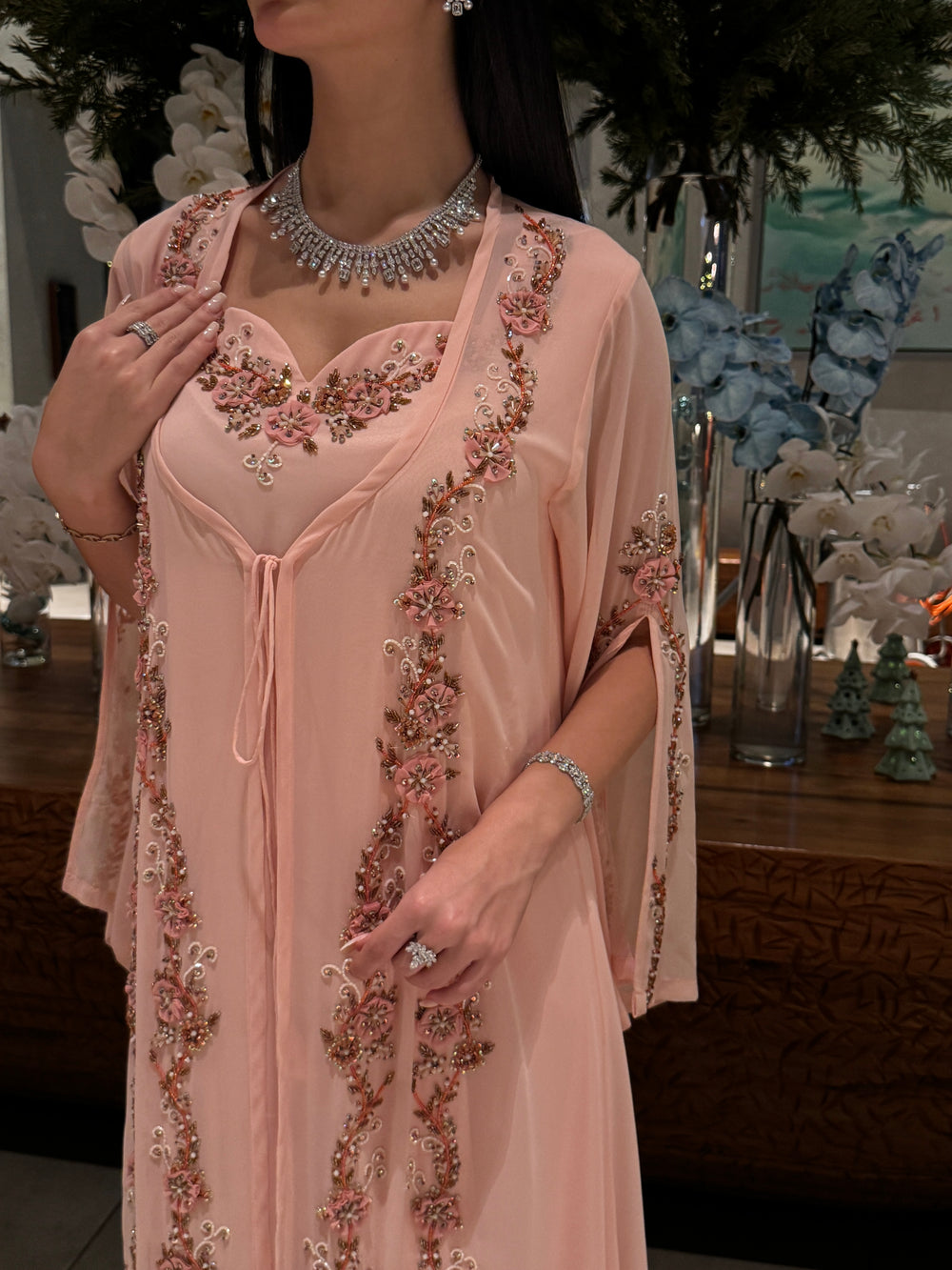 Soft peach/blush-colored outfit with a flowing, elegant silhouette